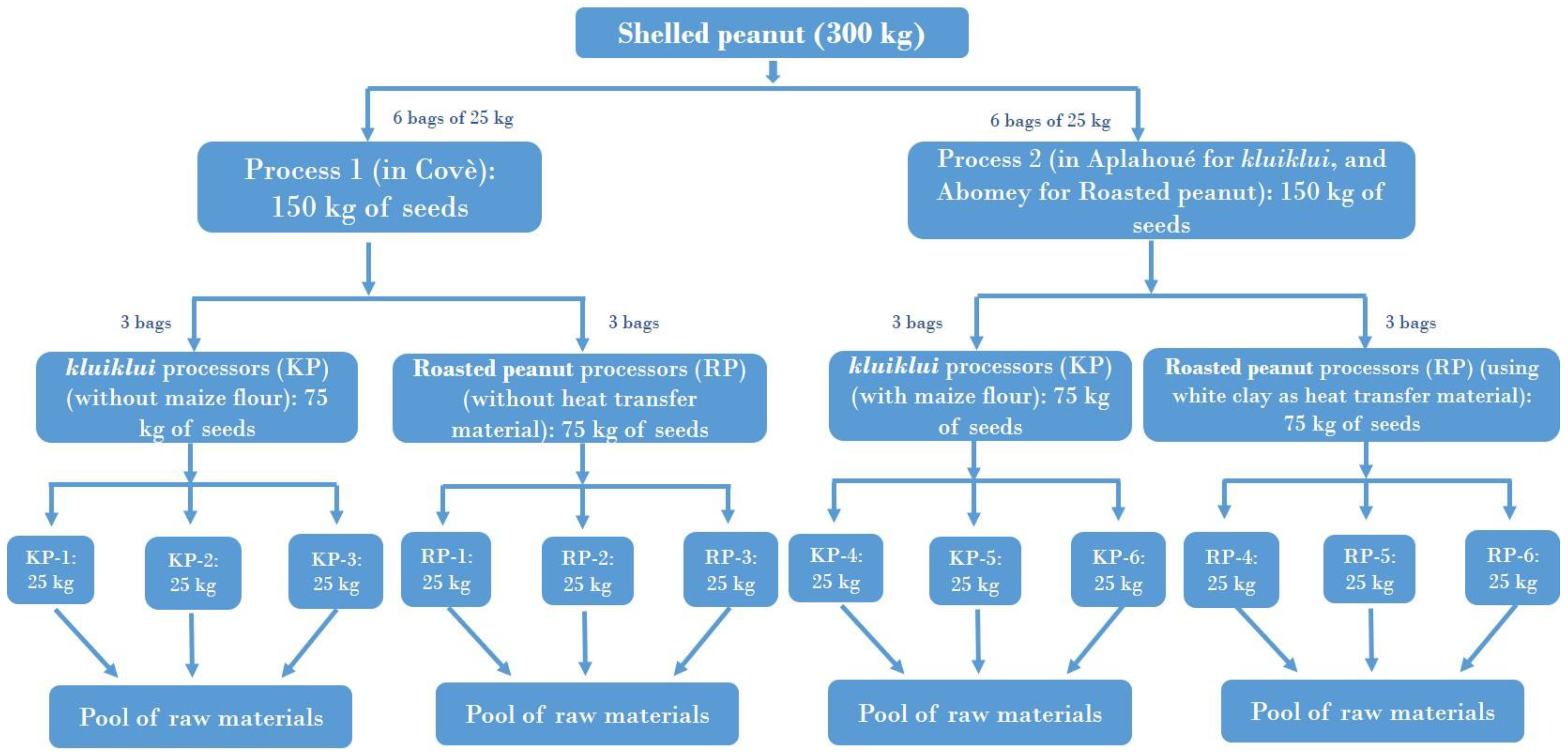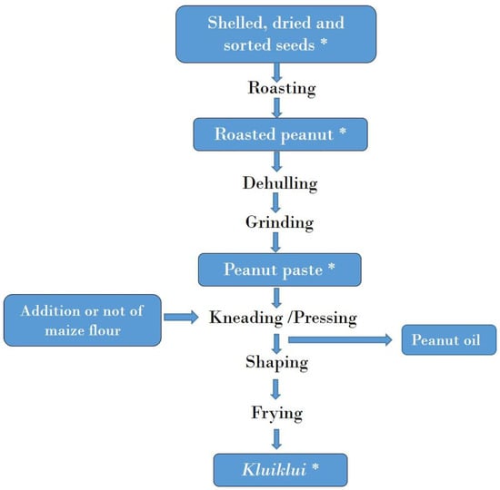 The mycotoxin contamination of kluiklui samples collected during processing practices is presented in Table 2 and Table S4. All roasted peanut samples (roasting being the first step of the process, see Figure 4) were below the LOD for all the mycotoxins analysed, showing that roasting did not contribute to mycotoxin contamination during kluiklui production process.