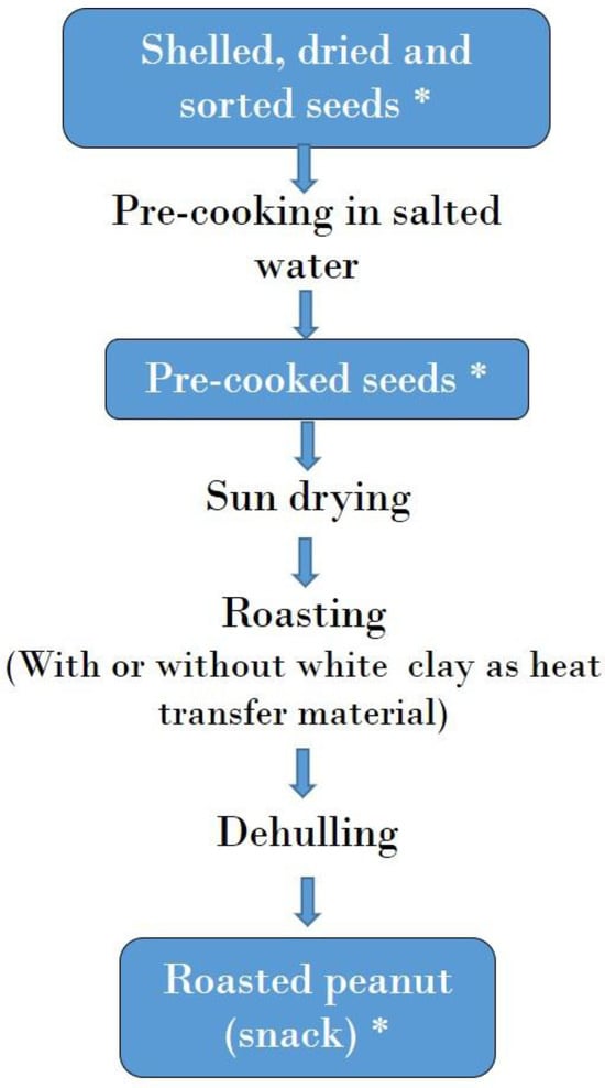 - Adeniran, H.A.; Ikujenlola, A.V.; Nd’janton, G.N. Effect of Processing Conditions on the Aflatoxin Content of Kulikuli-A Groundnut-Based Fried Snack. Ann. Clin. Nutr. 2022, 5, 1023. [Google Scholar]