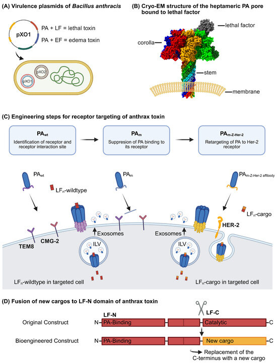 Understanding the mechanisms behind anthrax toxins and their development into a pioneering tool. (A) Two plasmids pXO1 and pXO2 are required for full virulence. The plasmid pXO1 encodes three distinct proteins, namely protective antigen (PA), lethal factor (LF), and edema factor (EF). The three proteins assemble into two distinct toxins: lethal toxin, which is composed of protective antigen (PA) and lethal factor (LF), and edema toxin, comprising PA and edema factor (EF) or a mixture. One to three enzymes can be attached to the heptamer. Instead, pXO2 is essential for capsule formation. (B) Cryo-EM structure of the heptameric PA pore bound to lethal factor (Accession number PDB database: 6PSN). The PA oligomeric pore enables the translocation of LF or EF into host cells. (C) Engineering steps for receptor targeting to specific host cells. First, the two anthrax receptors, namely TEM-8 and CMG-2, were identified and the toxin binding sites subsequently mutated (double-mutated PA (PAm)) to inhibit the binding of protective antigen (PA) to its cellular targets. Next, a receptor-targeting motif of interest was fused to PAm, as demonstrated by the PAm-Z-HER-2 fusion protein, which enables the selective killing of HER-2-expressing cells. Toxin-loaded exosomes may reach additional cells (compare Section 10). (D) The N-terminal domain of lethal factor (LF) mediates binding to protective antigen (PA), while the C-terminal domain (LF-C) can be replaced for new cargo proteins. Created in BioRender. Wetterer, G. (2025) https://BioRender.com/r4ozkca.