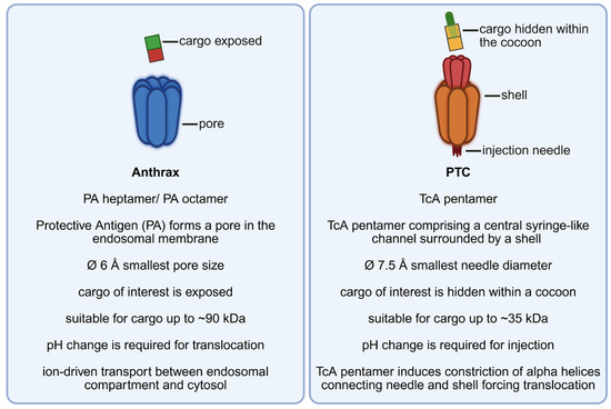Syringe-like toxin complexes (TCs) are produced by insect pathogens like Photorhabdus and Xenorhabdus species to inject toxins directly into insect cells [81,82,83,84]. Some of the TCs bind to insect as well as to mammalian cells. The injection machines solely formed by proteins are composed of three subunits: TcA, TcB and TcC [85]. These come together in a 5:1:1 (A:B:C) stoichiometry and shape a high-molecular-mass (~1.7 MDa), tripartite ABC-type holotoxin [86]. Oligomerization of TcA to a homo-pentamer results in the formation of a large (~1.4 MDa) structure that contains a central syringe-like channel, which is surrounded by a shell [87]. This toxin part is required for cell binding and injection of Tc toxins. In contrast to anthrax toxin, these enzymes are not freely exposed to the surrounding fluids but congregate into a cocoon-like complex composed of TcB and TcC. This cocoon-like structure, with the enzyme packed inside, interacts with the top of the injection channel to complete the holotoxin [88,89]. The enzymatic part of PTCs is located at the C-terminus of TcC [89,90]. The toxic enzyme is autoproteolytically separated from the TcC N-terminus to be injected through the needle [86]. In engineered Photorhabdus toxin complexes (PTCs), this C-terminal part of TcC has been exchanged for diverse cargo proteins, like Clostridium botulinum C3 toxin or a luciferase, for quantitative analysis of the number of injected proteins. All these artificial proteins can be delivered into living mammalian cells [91,92]. Due to functional delivery, the cargo seems packed into the cocoon already during recombinant expression of the fusion protein. Thus, the size of the cargo seems limited by the space within the cocoon. Like shown for anthrax and single-chain bacterial toxins, pH changes are required for the translocation of the enzyme/cargo. For PTCs the basic nature of the insect gut or acidification of maturing endosomes in mammalian cells likewise induces conformational changes within the TcA pentamer, inducing the constriction of alpha helices which connect the “needle” with the “shell” [93]. The loaded enzyme (or cargo protein) is thereby injected into the cytosol [94,95,96]. A recent publication analyzing prepore-to-pore transition suggests a tip diameter of about 7.5 Å, which is close to the smallest diameter of the anthrax pore (6 Å) and therefore likewise needs unfolding of the cargo to be transported [97] (Figure 2).