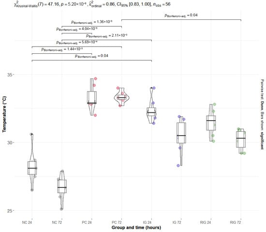 Distribution of thermographic data of the groups Positive control (PC); Negative control (NC); Infrared (IG); and Red plus Infrared (RIG) at different treatment times (p values of the Dunn test). Data represent mean values obtained from 10 animals per subgroup (n = 10).