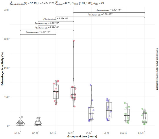 Distribution of edematogenic data in the groups Positive control (PC); Negative control (NC); Infrared (IG); and Red plus Infrared (RIG) at different treatment times (p values of the Dunn test). Data represent mean values obtained from 10 animals per subgroup, except for the IG-24 subgroup (n = 9) due to one sample being excluded because of technical issues.