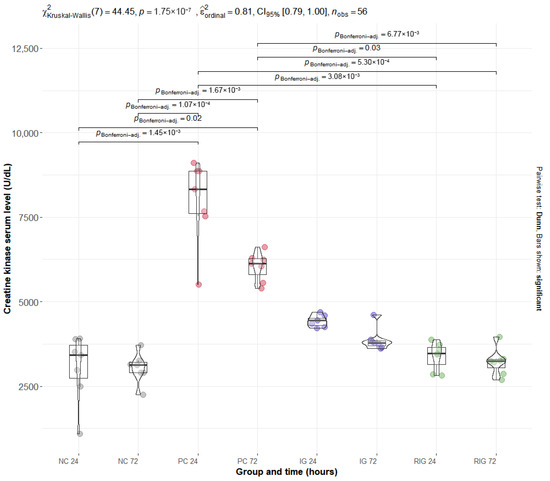 Distribution of serum CK values in the groups Positive control (CP); Negative control (NC); Infrared (IG); Red plus infrared (RIG) at different treatment times (p values of the Dunn test). Data represent mean values obtained from 7 animals per subgroup (n = 7).