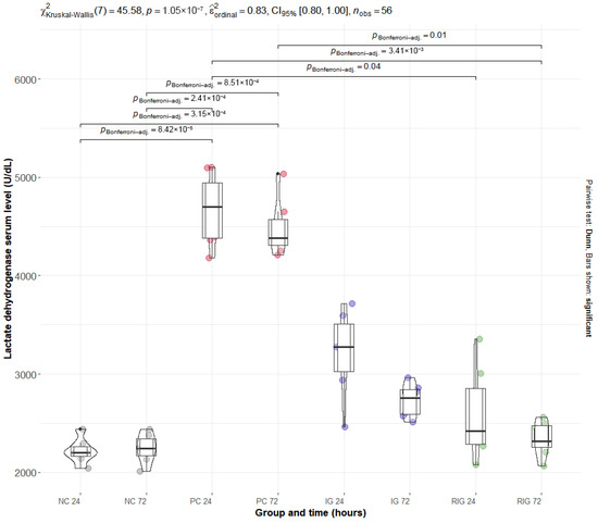 Distribution of serum LDH values in the groups Positive control (CP); Negative control (NC); Infrared (IG); Red plus infrared (RIG) at different treatment times (p values of the Dunn test). Data represent mean values obtained from 7 animals per subgroup (n = 7).