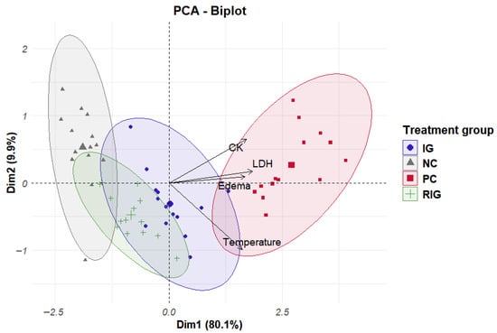 Furthermore, in PC1, all variables showed positive correlations and similar weights, suggesting that this component reflects a general inflammatory pattern, in which the parameters behave in a coordinated manner. On the other hand, PC2 showed a strong negative association with temperature (−0.82) and a positive association with the other variables, with CK (0.54) having the greatest influence on this component, followed by LDH (0.14) and edema (0.08). This pattern indicates that PC2 is related to an axis of variation associated with muscle temperature, suggesting that after treatment, temperature may fall while the other parameters are still high.