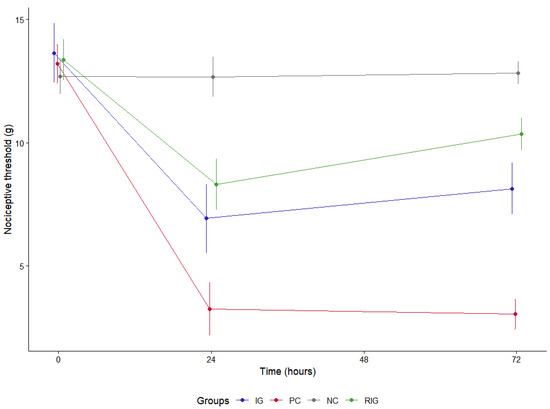 For the evaluation of MNT, the basal threshold of the animals was established prior to the execution of the experimental protocol (13.24 g ± 0.95) and, as expected, no differences were identified between the groups in this period (time 0). After the treatments were carried out, it was observed that the inoculation of the saline solution maintained the threshold close to the basal value in the NC at both evaluation times (12.69 g ± 0.66). In contrast, BV caused a significant reduction in the threshold when untreated (reducing to 8.18 g ± 1.27), whereas, in the treated groups, the values remained closer to those observed in the NC group (RIG—11.35 g ± 1.17, IG—10.60 g ± 2.27).