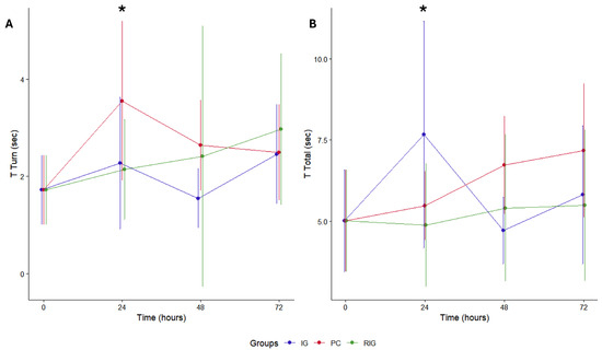 The evaluation showed a gradual increase in total T and a peak at 24 h in T Turn for all groups. The IG and RIG groups presented lower T Turn values, with significant differences only between the CP at 24 h (p = 0.044) (Figure 7A). The pattern was similar in relation to total T, with differences between the treated groups and the PC at 24 h (p = 0.033) (Figure 7B). Thus, it is understood that BV reduced locomotor capacity more significantly in the first 24 h after inoculation and that treatments with photobiomodulation (IG and RIG) helped to attenuate this motor impairment in the same period.