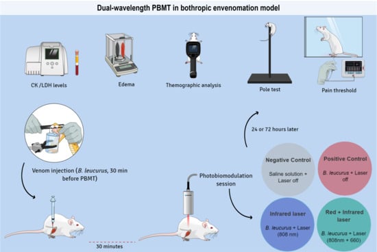 - Lauria, P.S.; Maia-Marques, R.; Oliveira, R.; Nunes, V.L.C.; Casais-e-Silva, L. Effects of Photobiomodulation Therapy on the Local Experimental Envenoming by Bothrops leucurus Snake. J. Photochem. Photobiol. B Biol. 2020, 210, 112087. [Google Scholar] [CrossRef]