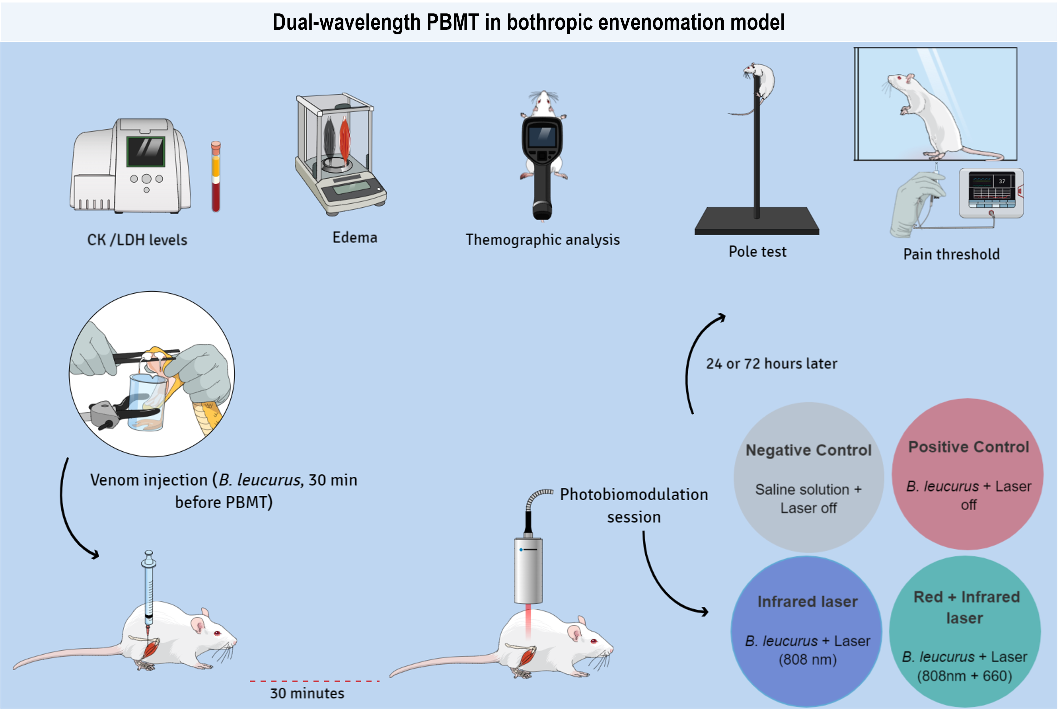 Silva, G.D.d.; Silva, F.L.; Sevá, A.d.P.; Silva, J.F.; Deorce, D.M.; Costa Junior, N.d.J.d.; Silva, F.A.; Filho, F.A. Photobiomodulation with Combined Wavelengths Results in Improved Clinical Recovery in a Murine Model of Bothrops leucurus Venom Envenomation. Toxins 2025, 17, 535. https://doi.org/10.3390/toxins17110535