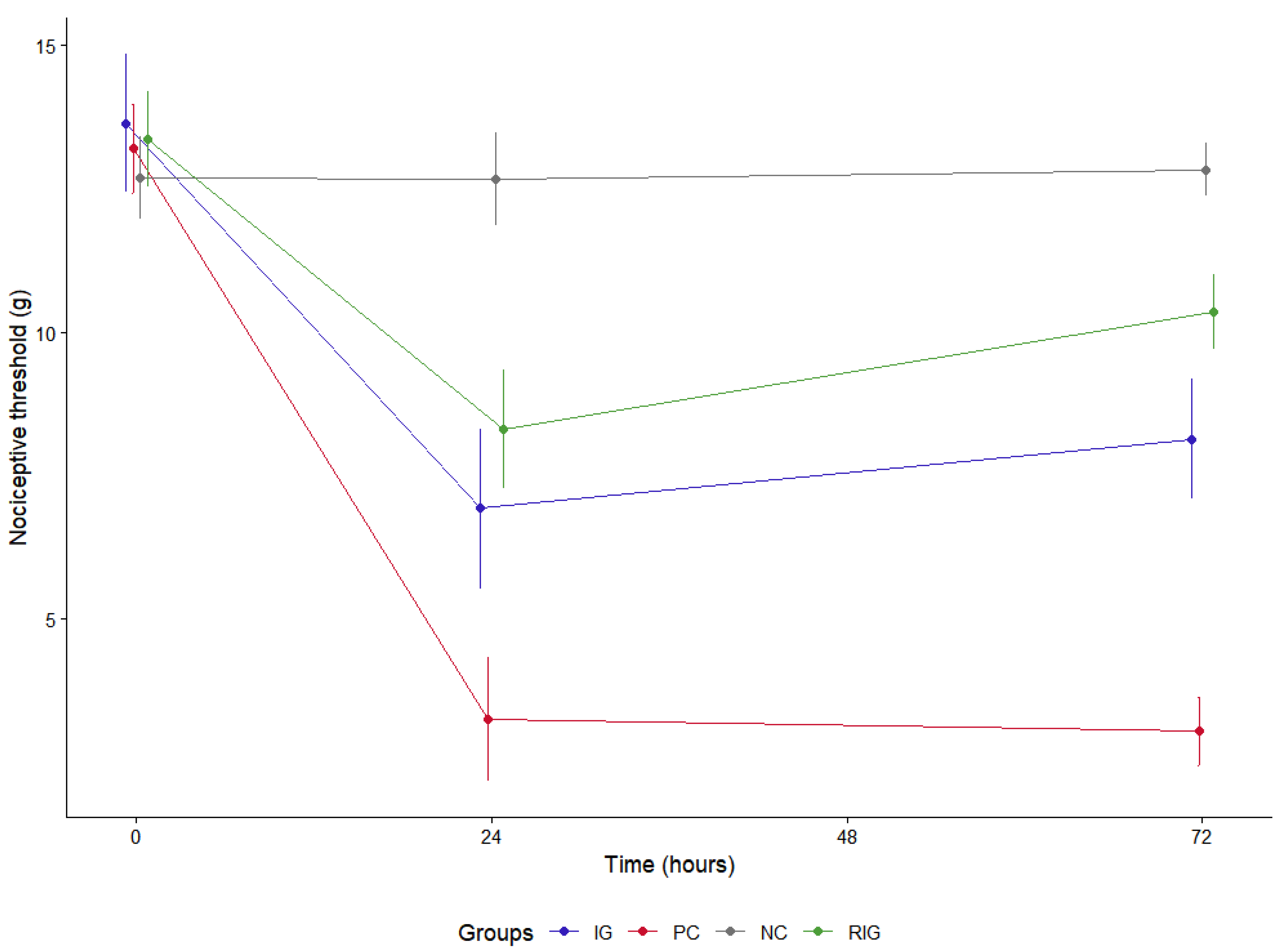 5.4. Assessment of Mechanical Nociceptive Threshold (MNT)