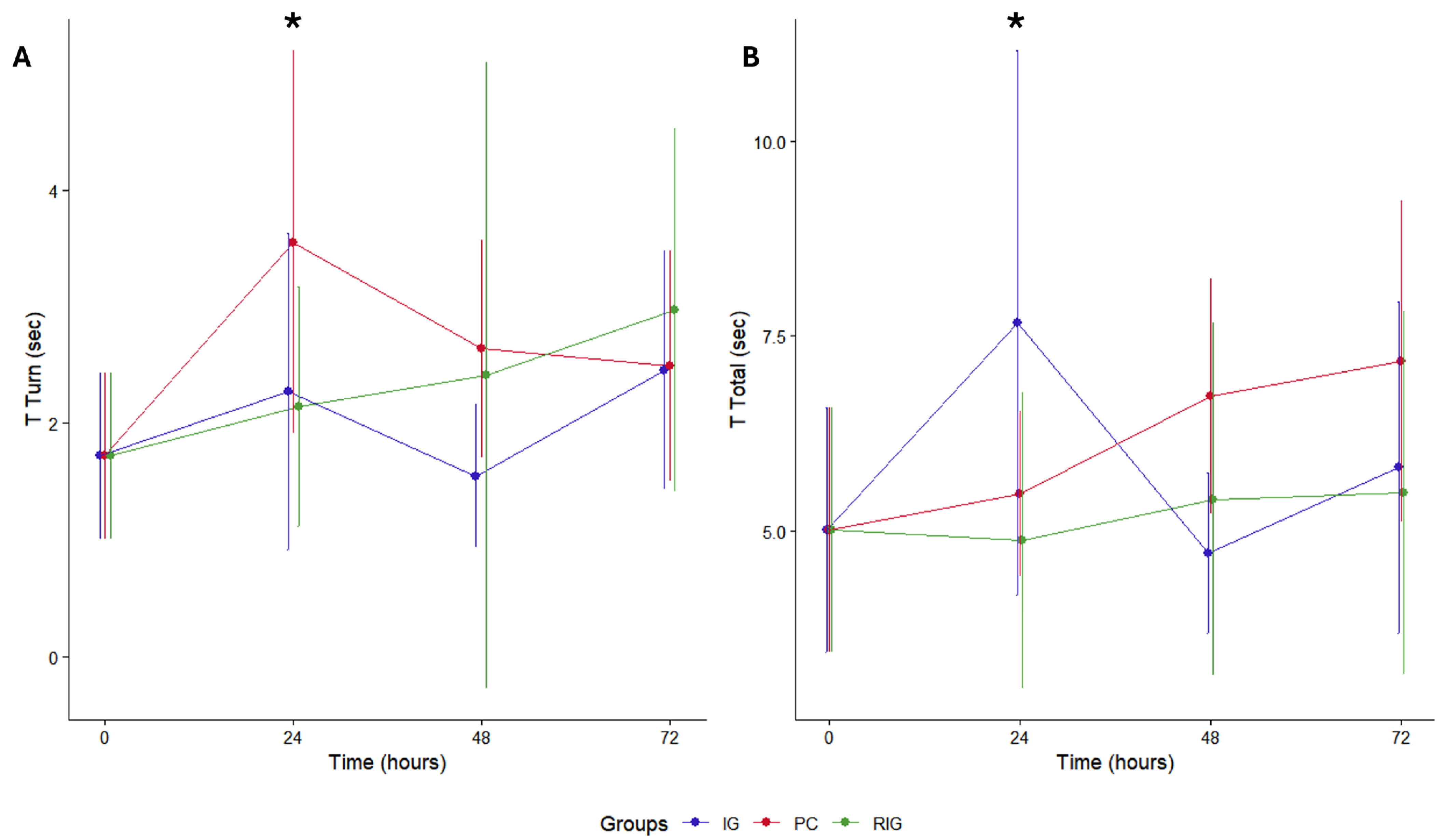 2.6. Pole Test Reveals Acute Motor Deficit Induced by Bv and Functional Improvement Associated with Laser Photobiomodulation