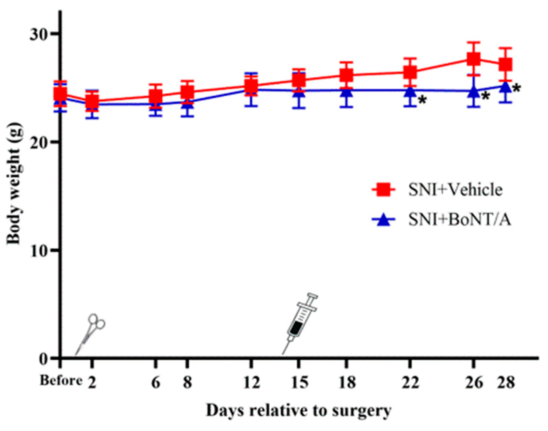 APA StyleOmoniyi, A. A., Hammer, R. E., Josefsen, S., Richner, M., Lezmi, S., Vægter, C. B., Kalinichev, M., Karlsson, P., & Nyengaard, J. R. (2025). The Activities of Recombinant Botulinum Toxin A on Spared Nerve Injury-Induced Neuropathic Pain in a Diabetic Mice Model. Toxins, 17(11), 545. https://doi.org/10.3390/toxins17110545