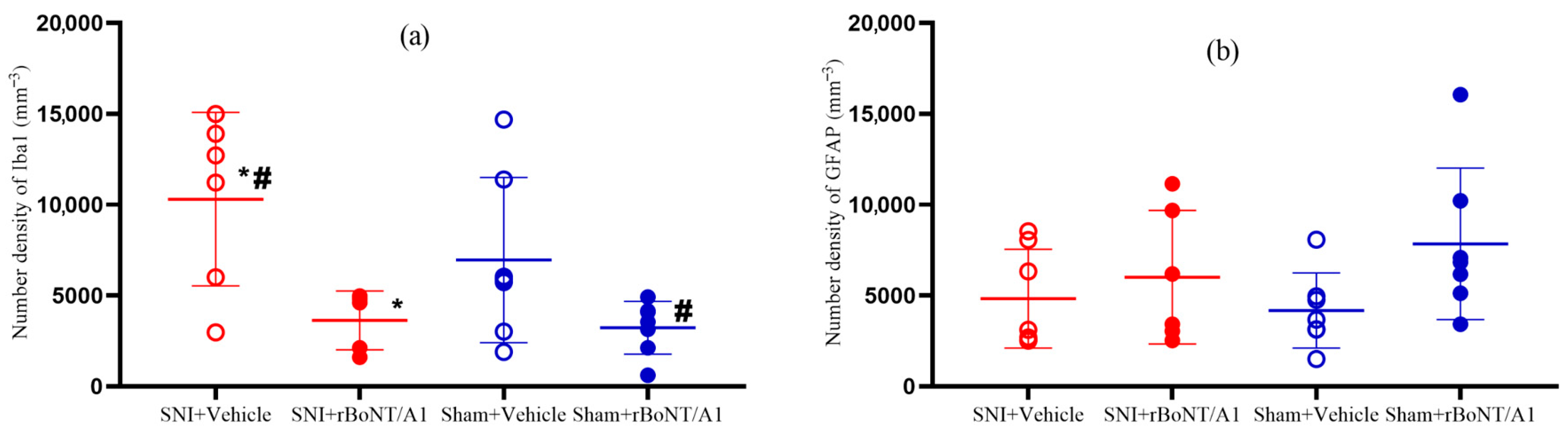 2.3. Number Density of Iba1-Marked Cells in the Spinal Cord