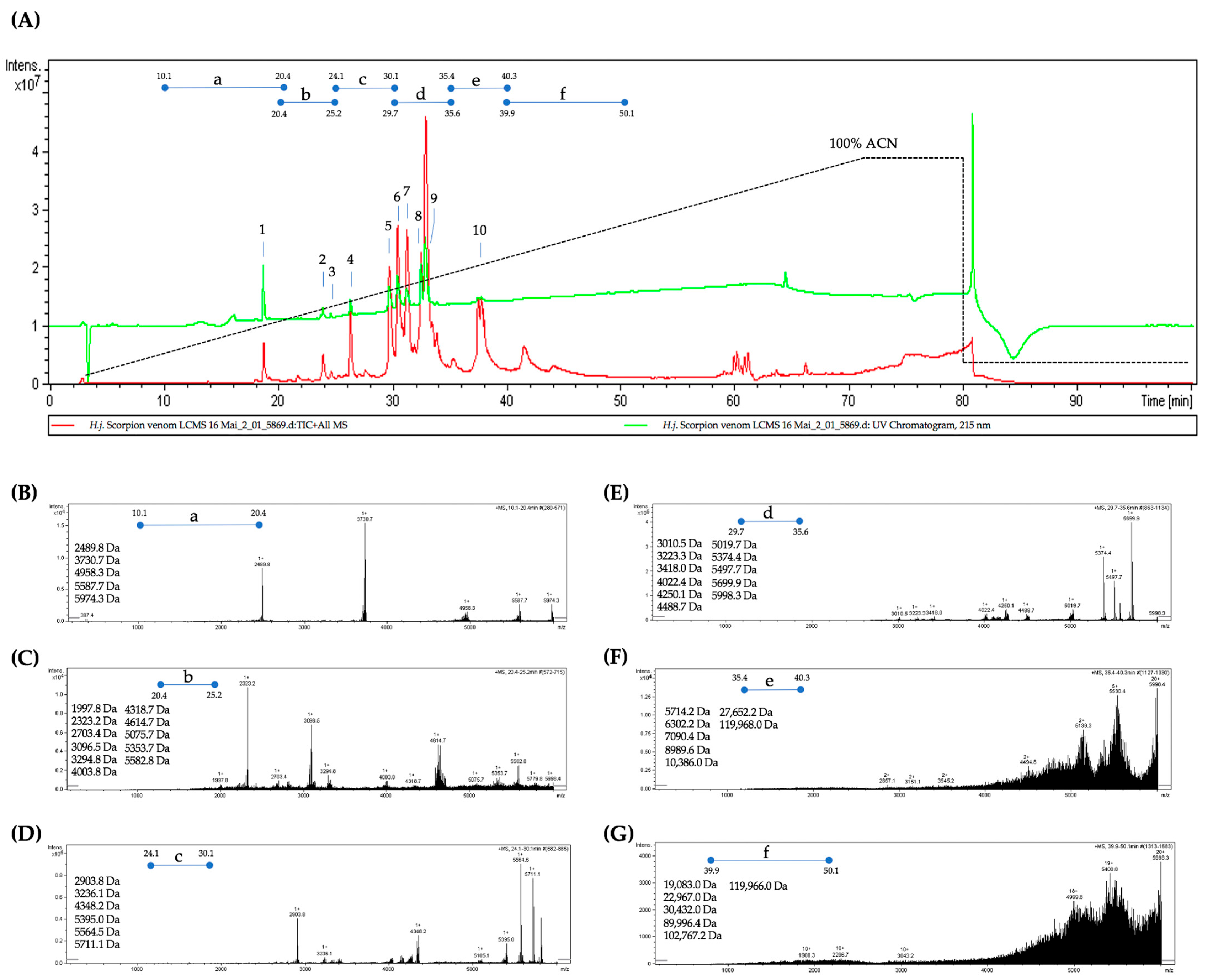 - Ghezellou, P.; Jakob, K.; Atashi, J.; Ghassempour, A.; Spengler, B. Mass-Spectrometry-Based Lipidome and Proteome Profiling of Hottentotta saulcyi (Scorpiones: Buthidae) Venom. Toxins 2022, 14, 370. [Google Scholar] [CrossRef] [PubMed]