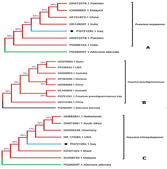 Phylogenetic tree was constructed for three isolates belonging to three Fusarium species isolated from wheat stored in Iraq. (A): F. oxysporum (PQ721292.1 Iraq); (B): F. pseudograminearum (PQ721291.1 Iraq); (C): F. chlamydosporum (PQ721294.1 Iraq).