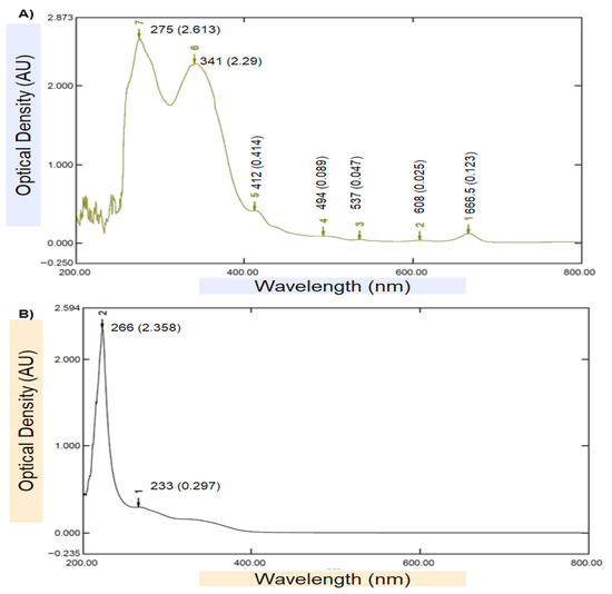 UV–Visible spectrophotometer test: (A). DVE, (B). Chitosan NPs loaded with DVE.