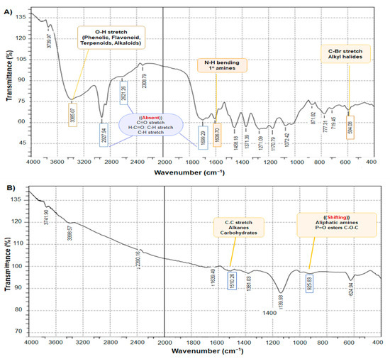 Figure 3 exhibits the FTIR spectra of the DVE and chitosan NPs loaded with DVE and shows distinct peaks characteristic of various biomolecules, including phenol and alcohol (3610–3640 cm−1). A key observation is the difference in intensity between the amide I peak (1699.29) cm−1 in DVE spectrum (Figure 3A) and the corresponding peak (1639.94) cm−1 in the DVE-loaded chitosan NPs spectrum (Figure 3B). The higher intensity in the nanoparticle’s spectrum suggests a higher concentration of amides associated with the nanoparticles. This finding could be attributed to the attachment of many biomolecules during the synthesis process, potentially acting as a stabilizing agent. On the other hand, the absence of some peaks in chitosan NPs loaded with DVE (1150–1300, 1685–1710, 2850–3000 cm−1) referred to the attachment between DVE, and chitosan molecules and our results agreed with the result of the previous study [29]. When the C-H stretch was seen at 2927 cm−1, it provided structural information on chitosan.