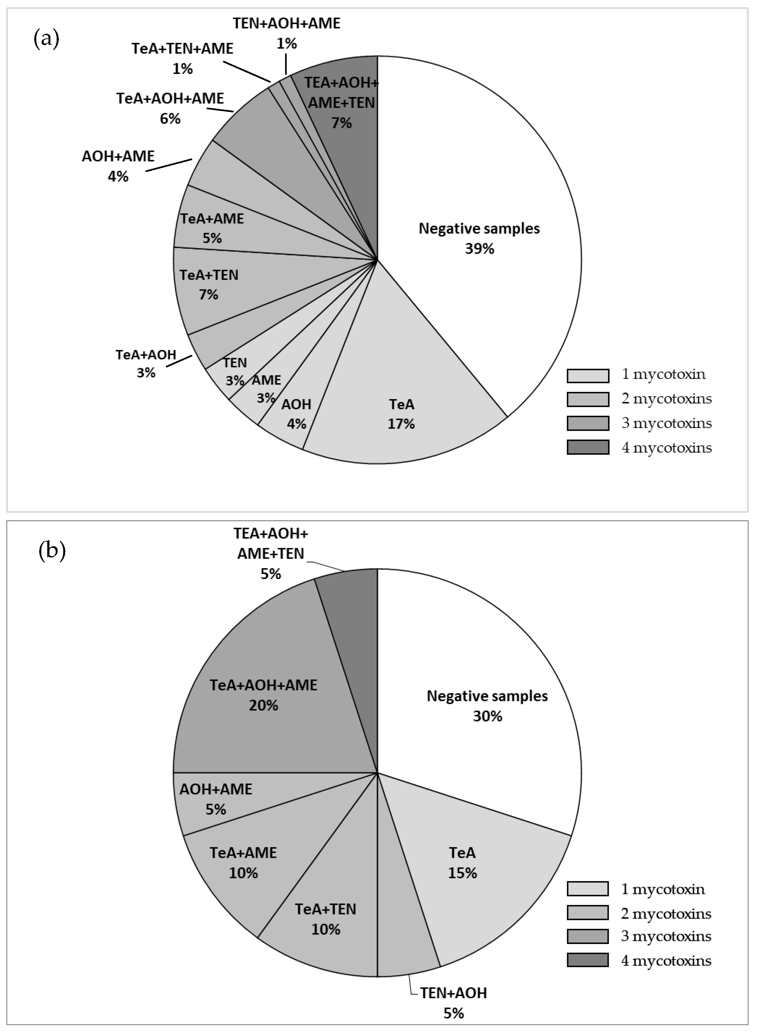 - Lattanzio, V.M.T.; Verdini, E.; Sdogati, S.; Bibi, R.; Ciasca, B.; Pecorelli, I. Monitoring Alternaria Toxins in Italian Food to Support Upcoming Regulation. Food Addit. Contam. Part B Surveill. 2022, 15, 42–51. [Google Scholar] [CrossRef]