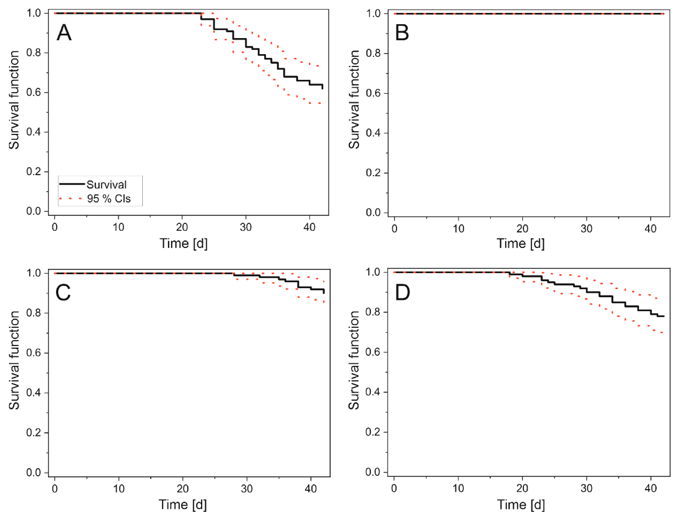 | Survival [%] | Growth [mg ± SD] | Reproduction [Nn ± SD] | Storage Compound Concentration [mg/g ± SD] | ||||