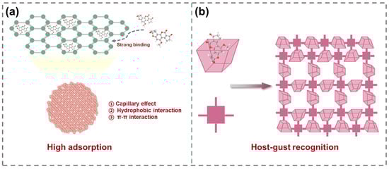 While MOFs offer high surface areas and tunable porosity, their practical use in foods can be limited by aqueous instability, potential metal leaching, and matrix interference []. In contrast, COFs are crystalline porous materials built from precisely designed organic monomers linked by robust covalent bonds, conferring superior structural integrity and chemical stability across wide pH and temperature ranges [,]. COFs combine ultrahigh surface areas with molecularly tunable pore architectures [,], and their adsorption performance can be enhanced through molecular-level design [,], such as installing specific functional groups and tailoring pore size/shape to optimize multiple interaction mechanisms (hydrogen bonding, π–π stacking, electrostatic interactions) []. The chemical diversity of COF building units also facilitates the integration of chemical and biological catalytic sites, enabling sophisticated adsorption–catalysis coupling within a single framework and addressing key limitations of conventional porous adsorbents [,].