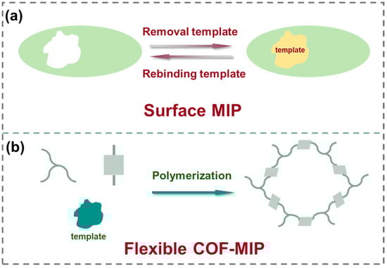 MIPs have gained significant attention as a class of promising enrichment materials for mycotoxin purification. In molecular imprinting, functional monomers and cross-linkers are polymerized around a template molecule, followed by template removal which leaves three-dimensional recognition cavities whose size, shape, and functional group orientation are complementary to the target analyte [,]. These selective binding sites endow MIPs with high affinity and specificity for particular mycotoxins in complex matrices. However, compared to COFs, MOFs, and conventional adsorbents, MIPs suffer from several intrinsic limitations including restricted accessibility of active sites and slow mass transfer, which hinder their implementation in food systems []. Consequently, current research focuses on strategies such as surface imprinting and sacrificial support techniques to bring recognition sites to the exterior, increase porosity, and accelerate diffusion [].