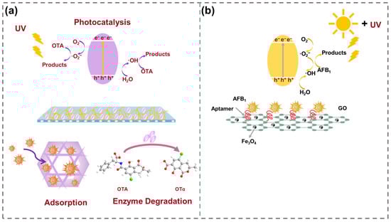 The adsorption–degradation coupled systems integrate the advantages of adsorptive support materials and catalytic components, enabling a seamless cascade of adsorption and degradation processes with high catalytic efficiency. Systems composed of molecular recognition materials and catalysts in the adsorption–photocatalyst system achieve directional mycotoxin detoxification in complex food matrices through synergistic interactions, while featuring facile synthesis and strong material specificity. This review summarizes enrichment-capable adsorbents used in the development of such bifunctional systems, along with their individual roles in mitigating fungal toxin contamination in food. Furthermore, the existing synergistic adsorption–photocatalytic and adsorption–biocatalytic systems were summarized for the first time, elucidating their design principles, bifunctional mechanisms, application performances, and potential toxicological aspects in the food matrices.