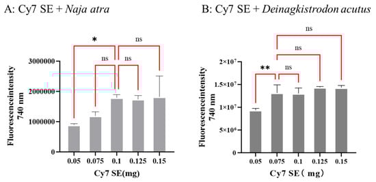 Characteristic peak areas of snake venom in the gradient labeling experiment. 0.1 mg of CY7-SE can completely label 1 mg of dried Naja atra venom powder, and 0.075 mg of CY7-SE can completely label 1 mg of dried Deinagkistrodon acutus venom powder ((A): Naja atra venom; (B): Deinagkistrodon acutus venom; n = 3, * p < 0.05, ** p < 0.01, ns p > 0.05).