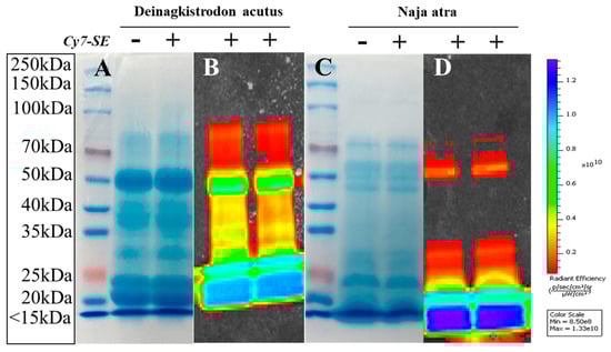 Conventional electrophoresis and fluorescence electrophoresis results of Deinagkistrodon acutus venom and Naja atra venom labeled with CY7-SE. The labeled venom components were not lost, could be fully labeled by CY7-SE, and were detectable by the small animal in vivo imaging system. (A): Unlabeled Deinagkistrodon acutus venom stained with Coomassie Brilliant Blue, (B): Fluorescent imaging of labeled Deinagkistrodon acutus venom, (C): Unlabeled Naja atra venom stained with Coomassie Brilliant Blue, (D): Fluorescent imaging of labeled Naja atra venom.