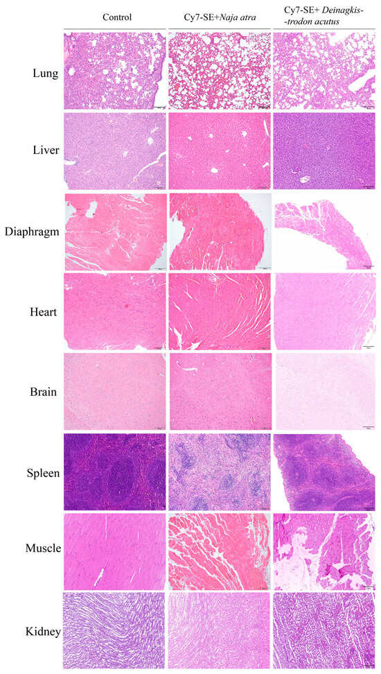 In conclusion, the histopathological alterations induced by CY7-SE-labeled Naja atra and Deinagkistrodon acutus venoms demonstrate congruence with clinical envenomation cases and experimental intoxication models in terms of organ-specific injury patterns, pathological progression trajectories, and morphological changes, validating that labeled venoms faithfully recapitulate the toxicological profiles of native venoms.