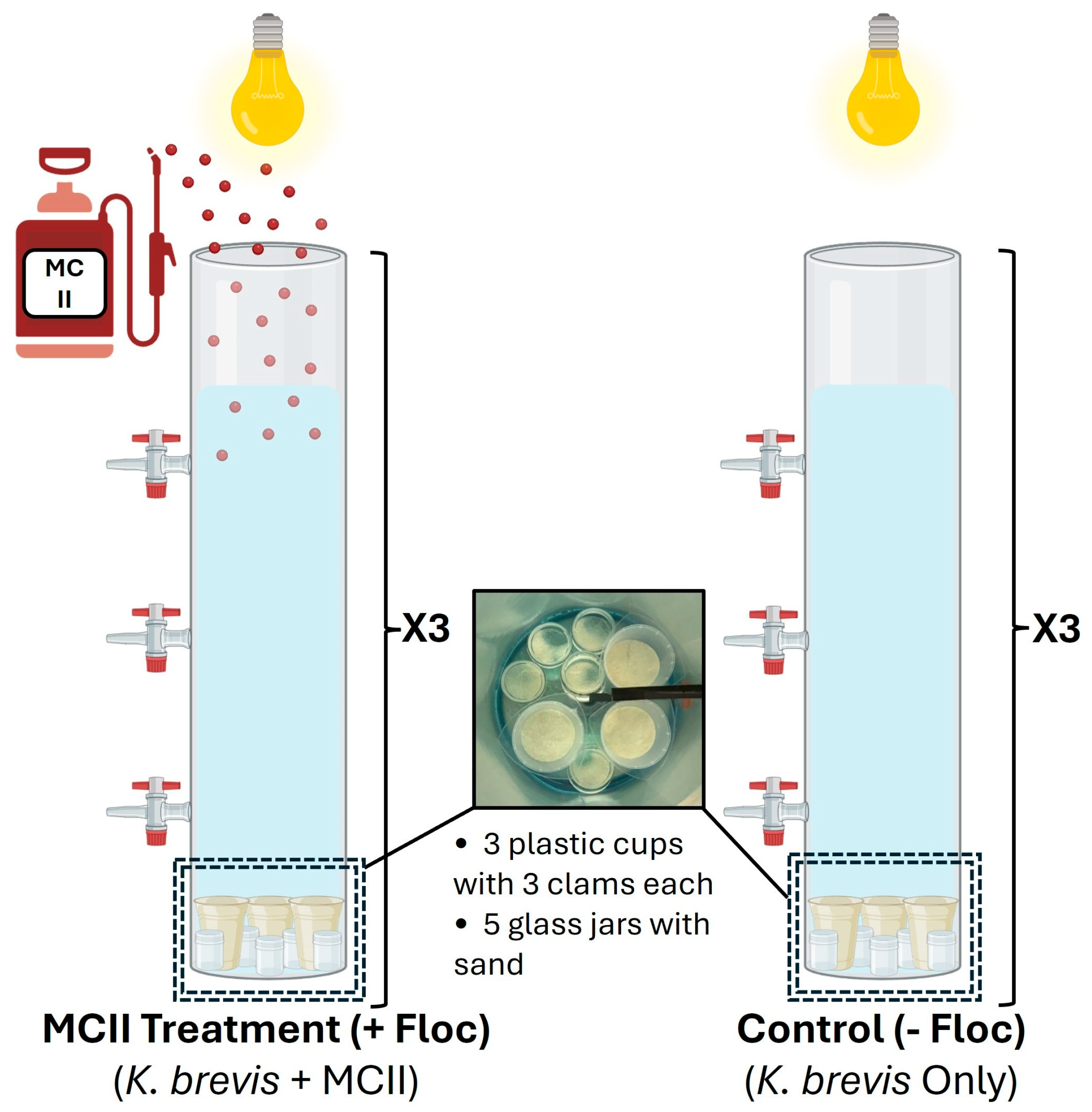 Figure 2. Each tank was fitted with three taps positioned at specific depths to allow representative sampling from the surface, middle, and bottom of the simulated water column. At the base of each tank, three plastic cups containing approximately 150 mL of sand were placed to hold clams and collect floc after treatment has taken place. Additionally, five glass jars filled with approximately 20 g of sand were included in each tank to collect settled floc for sediment toxin analysis. Overhead lights were installed above each tank to ensure consistent illumination for the added cellular culture. The experiment was conducted at 30 ppt, within the range of