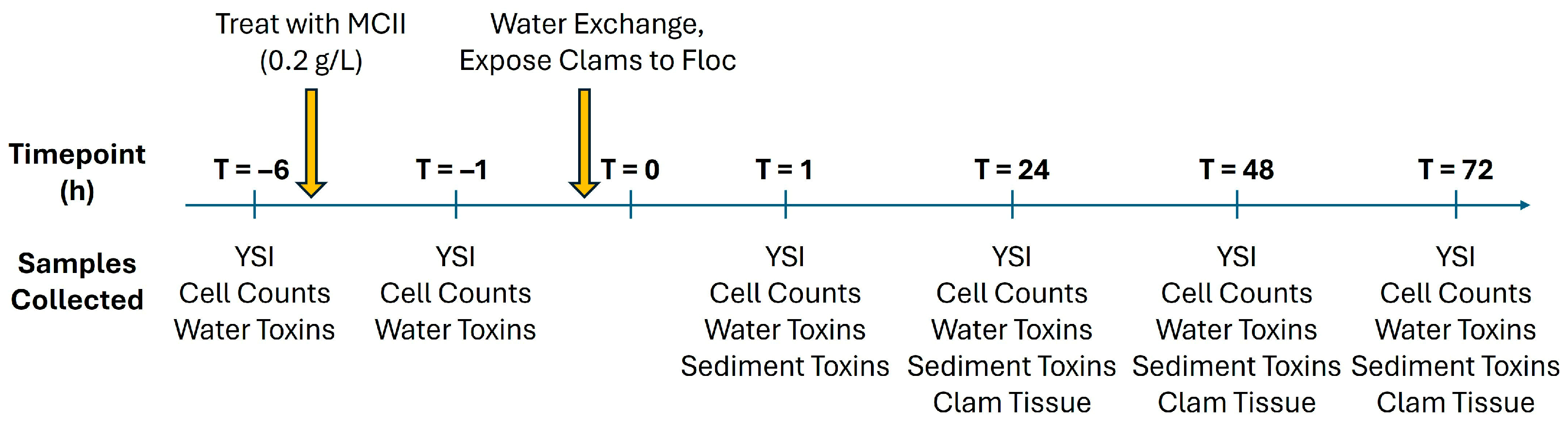 Sampling timeline for YSI water quality, cell counts, water toxins, sediment toxins and clam tissue toxins. Yellow arrows indicate MCII treatment time point and time at which water was swapped in each tank followed by addition of clams.