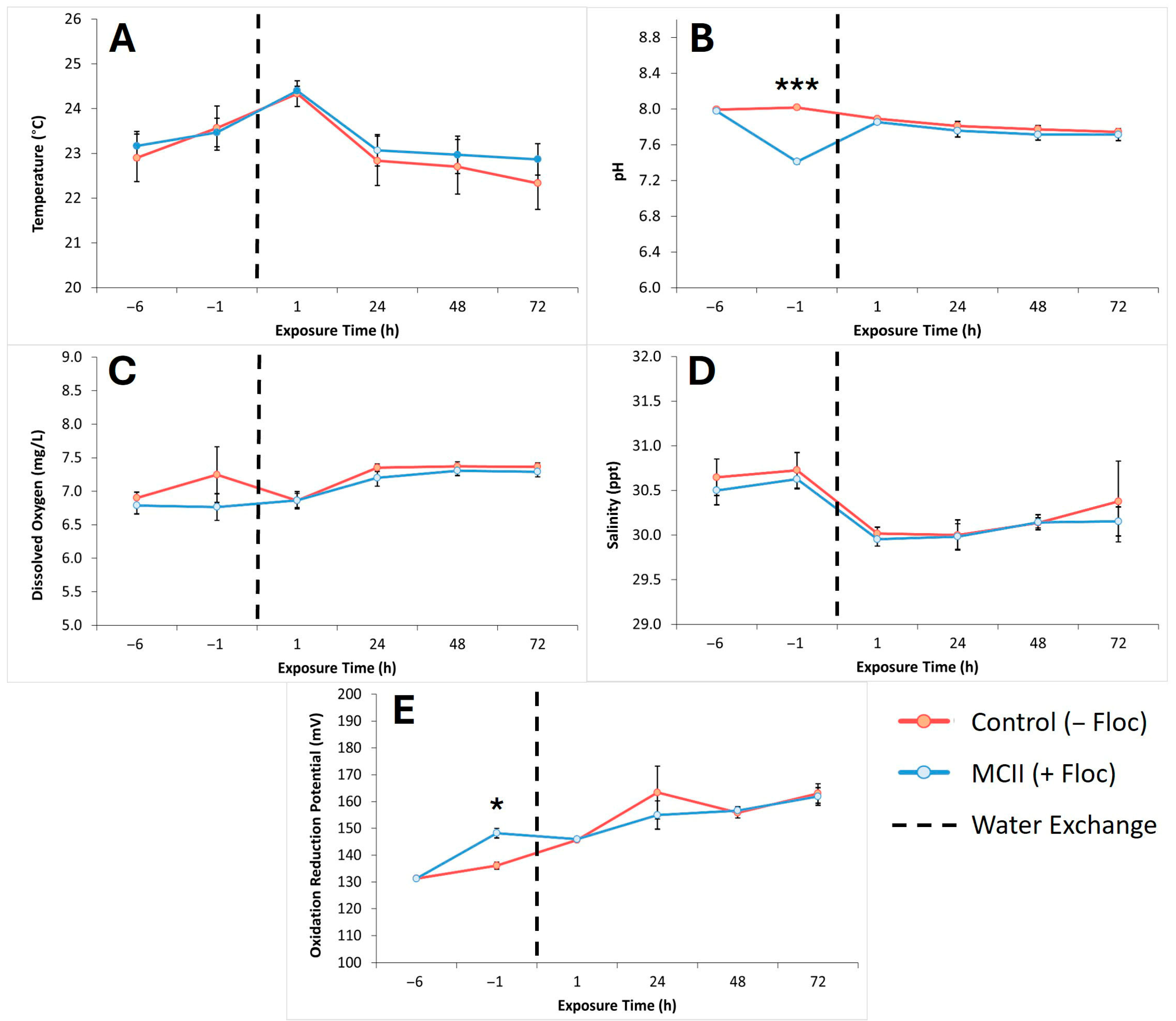 Figure 4A,C,D). During the first five hours of the experiment, temperatures in both the treatment and control groups increased by approximately 0.5 °C, followed by a gradual return to baseline levels over the subsequent 72 h. We surmise that variations in temperature reflect ambient temperature changes caused by the surrounding environment and were unrelated to MCII treatment. A comparison of water pH (