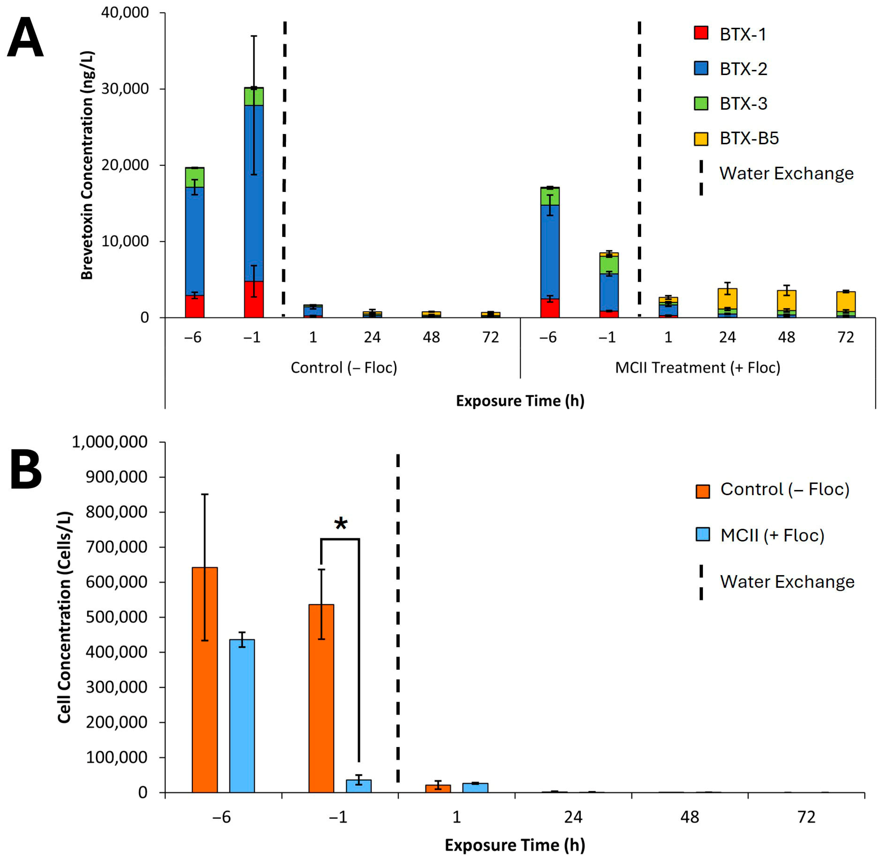Figure 5A,B). Following application and flocculation (T = −6 and −1), MCII treated (+floc) water showed an approximate 50% reduction in brevetoxin concentrations from 17,131 ng/L to 8532 ng/L, while control (−floc) samples exhibited a 1.5-fold increase over the same period (19,705 ng/L to 30,192 ng/L). In both groups, BTX-2 remained the dominant brevetoxin congener. Notably, MCII treatment led to a substantial decline in