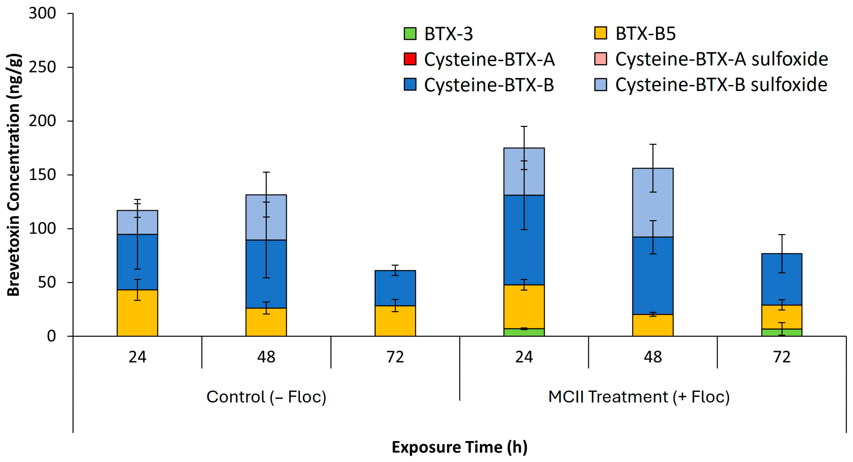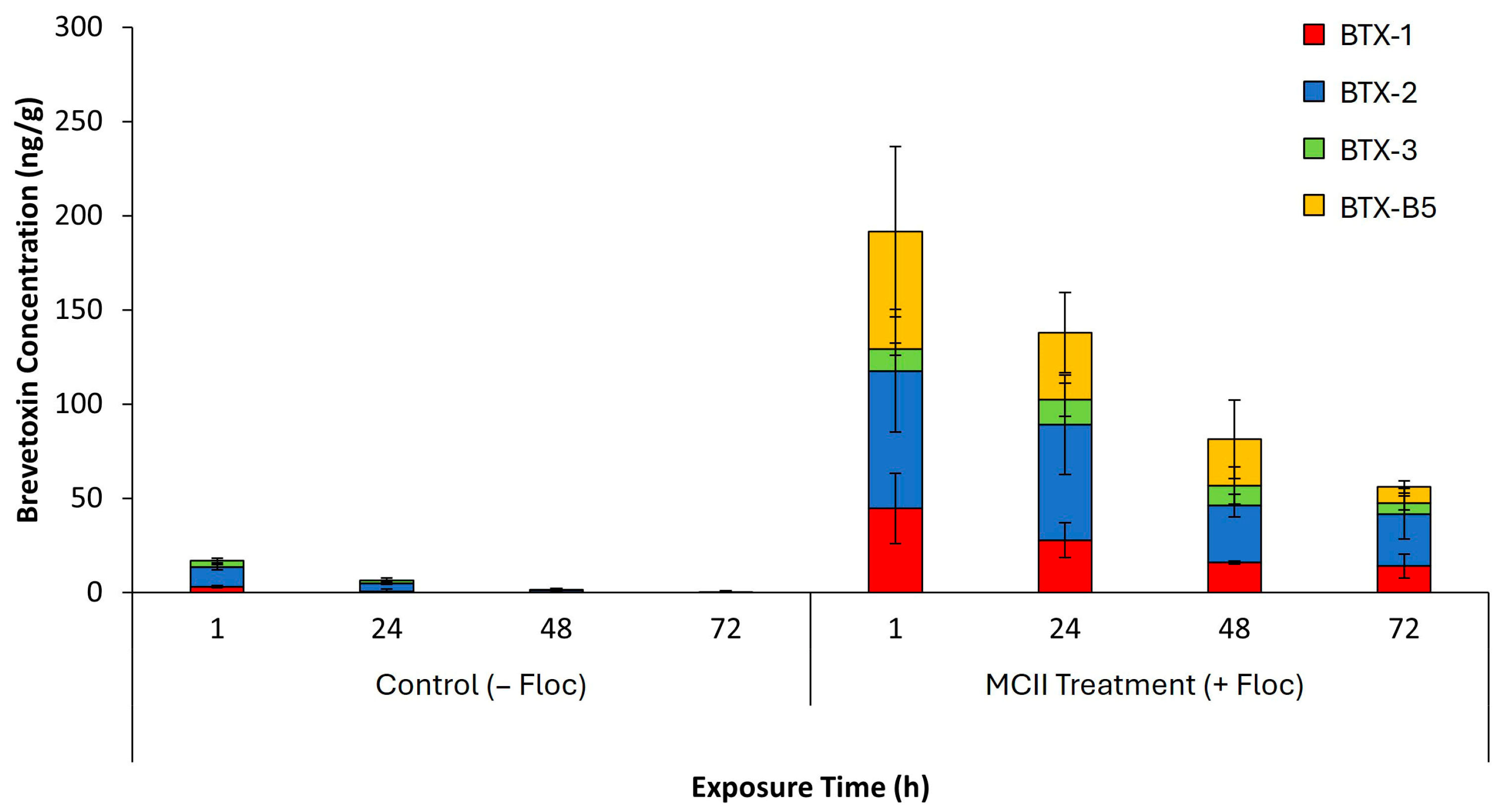 Figure 6). In control sediments, brevetoxin concentrations remained low across all time points, with levels ranging from 6 to 17 ng/g and becoming nearly undetectable by 72 h. This is as expected given that only a small number of cells or settled material would have been present in the control tanks after water replacement. BTX-2 was the predominant congener in these samples, with minimal contributions from BTX-1, BTX-3, and BTX-B5. In contrast, MCII treated (+floc) sediments exhibited a marked increase in total brevetoxin accumulation, initially measured at 191 ng/g and gradually declined to 56 ng/g by 72 h. All four congeners were present in MCII samples, with BTX-2 and BTX-B5 contributing most significantly. Brevetoxins analyzed in sediments potentially include toxins adhered to clay particles, toxins in flocculated