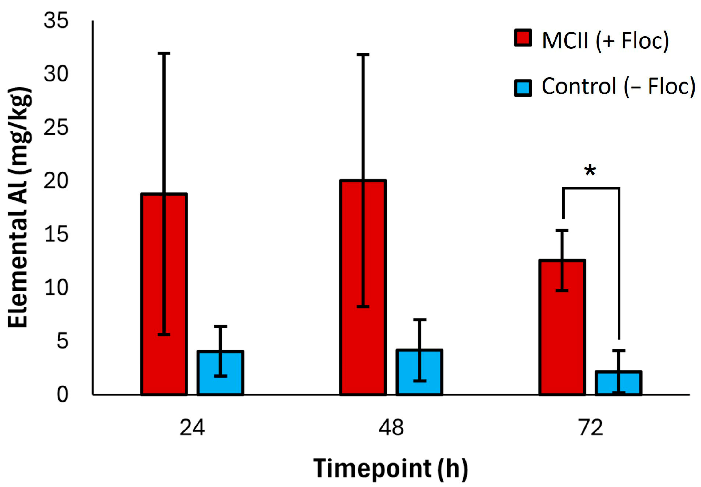 32]. Notably, across all time points, clams exposed to MCII treatment (+floc) accumulated aluminum at concentrations averaging 5.1-fold higher than those observed in controls (−floc) (