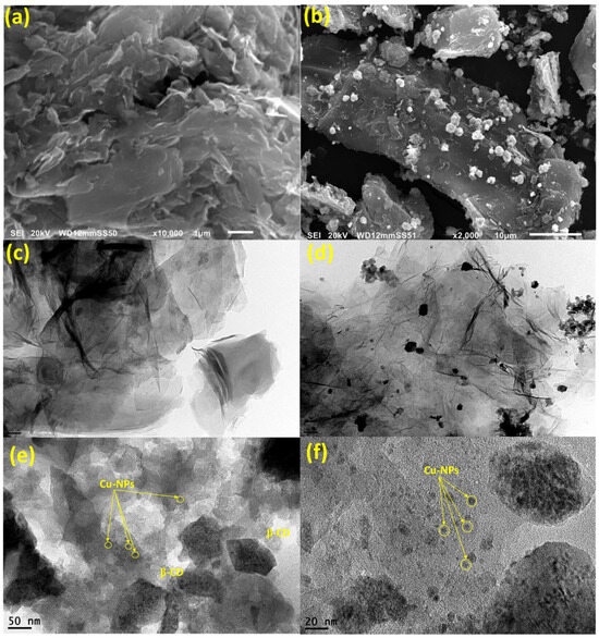 SEM (a,b) of CGO and Cu/β-CD@CGO, HRTEM of CGO (c) and Cu/β-CD@CGO (d–f) nanocomposites.