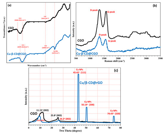 FTIR (a), Raman (b) and XRD (c) of Cu/β-CD@CGO.