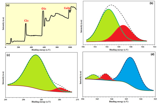 The surface morphologies of CGO sheets and the Cu/β-CD@CGO were investigated using HRTEM and SEM; the resulting pictures are presented in Figure 2a–e. The SEM picture of CGO (Figure 2a) showed a vertical compact stack morphology and a characteristic structure that resembles a wrinkled sheet. In the Cu/β-CD/CGO SEM picture (Figure 2b), the β-CD moieties and supported Cu-NPs account for the tiny draping circles. Thin wrinkled films were seen in the 3D-CGO HRTEM picture (Figure 2c), which resulted from covalent interactions causing the CGO sheets to aggregate. The dark regions on the CGO sheets in the HRTEM picture of the Cu/β-CD/CGO (Figure 2d–f) exhibited β-cyclodextrin and Cu-NPs parts. The more haphazard 3D porous structure and thicker, rougher, and uneven surface of the 3D Cu/β-CD@CGO nanocomposite show that the doping of β-cyclodextrin and Cu NPs onto the CGO surface was successful. Using the DLS approach, the average diameter of the Cu/β-CD@CGO was found to be 37.5 ± 1.4 nm. Three distinctive peaks of Cu-nanoparticles were revealed by the EDX spectrograph of the Cu/β-CD@CGO nanocomposite (Figure S2). The first peak is located at 0.83–1.07 keV (Lα1), the next peak is of the highest intensity at 7.88–8.25 keV (Kα), and the last one is located at 8.68–9.11 keV (Kβ). To determine and map the C, O, and Cu elements in the Cu/β-CD@CGO and to assess the homogeneity and dispersion of Cu-dopants, mapping EDX was carried out (Figure 3). Figure 4a displays the CGO and Cu/β-CD@CGO FTIR. The Cu/β-CD@CGO and the CGO’s aromatic groups were found to have C=C vibrations, which were responsible for the absorption spectrum at 1604 cm−1 [32]. The β-CD functioning was demonstrated by 1031.5 cm−1 (R-1, 4-bond skeleton vibration of β-cyclodextrin) and the large absorption bands at 3214–3436 cm−1 (O-H stretching vibration) that were affixed to the nanocomposite’s surface. On the ternary nanocomposite, the supported Cu-nanoparticles exhibit a significant characteristic peak at 1075 cm−1. It is clear from FTIR spectroscopy that β-CD and Cu nanoparticles are immobilized on CGO nanostructures. Raman analysis was typically used to describe CGO faults and disorder states. Both CGO and Cu-β-CD@CGO displayed unique D (1391, 1385 cm−1) and G (1635, 1622 cm−1) bands in their Raman spectra (Figure 4b). The D band was attributed to vibrational stretching of the sp3 C-atoms associated with defects and disorder. The G band was generated by the E2g mode first-order scattering that resulted from the stretching vibration of the sp2 carbon atom [33,34]. Furthermore, the peak at 2755 cm−1 for CGO redshifted and broadened owing to the existence of the 2D overtone band [35], suggesting that some CGO sheet aggregation occurred. In contrast, the Cu-β-CD@CGO nanocomposite did not have this band, confirming the function of Cu-NPs in preventing CGO sheet aggregation. XRD was conducted to confirm the structural features of the Cu-β-CD@CGO (Figure 4c). The CGO exhibits a distinctive peak (002) at 11.15 degrees. Three distinctive diffraction peaks at 43.42° (111), 50.14° (200), and 74.43° (220) are present in the Cu-NPs in Cu-β-CD@CGO, and they are in excellent accord with the card for standard Cu [36,37,38,39]. The CGO sheet’s extra broad (002) peak at position 25 indicates a rise in crystallinity as compared to the earlier spectra [40,41,42,43]. The presence of carboxylic groups in the material may be the cause of this increase in crystallinity. The nanocomposite’s XRD spectrum shows no additional peaks, showing that the manufactured product is highly pure. Figure 5a–d illustrates the XPS analysis and the various interactions among CGO, β-cyclodextrin, and Cu-NPs moieties in the developed nanocomposite. Figure 5a shows the full scan spectrograph of Cu-β-CD@CGO, and the C, O, and Cu elements were distinctly identified. Figure 5b–d depict the C1s spectra of the Cu-β-CD@CGO, signifying a broad peak at 286.5 eV for the C-O, C=O, and O-C-O groups, as oxidized carbon species, which confirms the increased abundance of oxygen-containing functional groups in CGO. The diminutive peak at 279.8 eV indicated Cu-C bonding typical of carbide species. The O1s spectra of Cu-β-CD@CGO (Figure 5c) exhibit two prominent peaks at 531.8 and 529.2 eV, corresponding to C-O, O-C=O, C=O, and Cu-O bonds [44]. Three bands were visible in the Cu2p spectra in Figure 5d at 933.8, 942.2, and 946.4 eV. The presence of the Cu(II) oxidation state is confirmed by the other two minor bands, whereas the strongest broad band, located at 933.8 eV, is attributed to Cu-NPs (CuO) [45].
