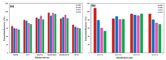 Impact of type of eluting solvent (a) and the volume ratio of MeOH/H2O (b).