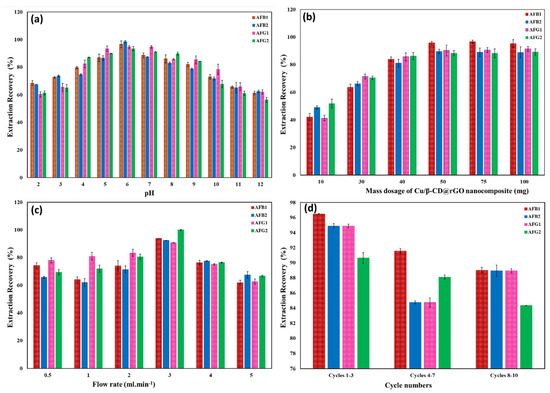 To ensure a successful d-SPE analysis, the target analytes must be thoroughly cleaned off the nanosorbent surface. This outcome depends on the eluting solvent’s polarity and solubility of the analyte. MeOH, DCM, MeOH/DCM, ACN, Me2CO, and MeOH/H2O were tested to achieve a complete elution of AFs from the surface of Cu/β-CD@CGO, as displayed in Figure 6a. Cu/β-CD@CGO can interact with AFs through the hydrophilic part (O-atoms containing groups) and the hydrophobic part (benzene rings). These types of interactions included complex formation, H-bonds, dipole–dipole, and π-π stacking. Therefore, nonpolar (DCM) and a mixture of polar (ACN, Me2CO) eluting solvents were supposed to function better, but this is not the case. A mixture of equal volume ratio of methanol and water (1:1 v/v) was utilized to get the best elution of AFs. Cu/β-CD@CGO’s high electrostatic interactions with AFs are explained via complex-bonding attraction among the functional groups of oxygen in AFs and the Cu-NPs.