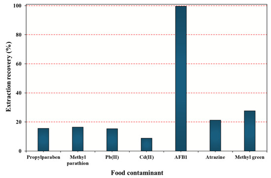The selectivity of the Cu/β-CD@CGO nanocomposite was evaluated by comparing its extraction performance toward AFB1 with other common food contaminants representing different chemical classes, including preservatives (propylparaben), pesticides (methyl parathion and atrazine), heavy metals (Pb2+ and Cd2+), and a cationic dye (methyl green). As shown in Figure 8, all non-aflatoxin contaminants displayed markedly low extraction recoveries, generally below 20%, indicating weak or negligible affinity toward the nanocomposite. In contrast, AFB1 exhibited an extraction recovery close to 100%, demonstrating a significantly stronger interaction with Cu/β-CD@CGO than any of the competing analytes. This pronounced contrast highlights the inherent selectivity of the nanocomposite toward aflatoxins. The selective behavior can be attributed to multiple synergistic interactions: (i) host–guest inclusion of the planar hydrophobic aflatoxin structure within the β-cyclodextrin cavity, (ii) π–π stacking and hydrogen bonding interactions with the CGO surface, and (iii) coordination between electron-rich functional groups of AFB1 and the Cu2+ centers anchored onto the composite. Such combined mechanisms are not favored for structurally unrelated contaminants like parabens, organophosphate pesticides, metal ions, or cationic dyes, which explain their minimal uptake. Overall, the results confirm that Cu/β-CD@CGO possesses a strong and highly selective affinity toward aflatoxins, with negligible cross-reactivity toward other coexisting food contaminants. This selectivity makes the material particularly suitable for reliable extraction and enrichment of aflatoxins in complex food matrices.