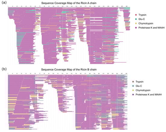 Subsequently, peptide sequences from both de novo sequencing and the database search were merged for a second sequence assembly. The assembled sequences were then aligned with homologous references, yielding the complete Ricin A and B chains. The assembly quality was assessed by calculating sequence coverage, which was confirmed to be 100% for both chains, as presented in Figure 5. The contributions of different digestion types to sequence coverage were not uniform, with non-specific cleavages (including proteinase K and MAAH) providing a greater contribution to overall coverage. The peptide sequences used for the second-round assembly are listed in Table S5.