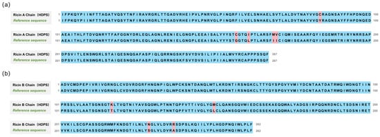 Alignment of the amino acid sequences of Ricin toxin obtained via HDPS with the reference sequence (UniProt P02879, NCBI GI:132567). (a) Ricin A chain alignment, achieving 98.13% sequence accuracy. (b) Ricin B chain alignment, achieving 98.47% sequence accuracy.