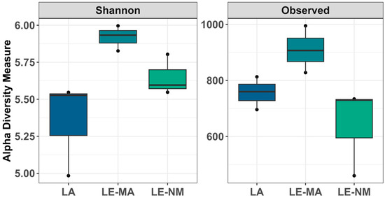 Alpha diversity showing Shannon Diversity and bacterial richness (observed taxa) in soil samples at day 0. The box in the plots indicates the interquartile range (IQR; middle 50% of the data), the middle line represents the median value, and the whiskers represents 1.5 times the IQR. Lacombe (LA) samples originated from central Alberta. LE samples were from Lethbridge in southern Alberta and included plots fertilized with manure (MA) or not fertilized (NM).