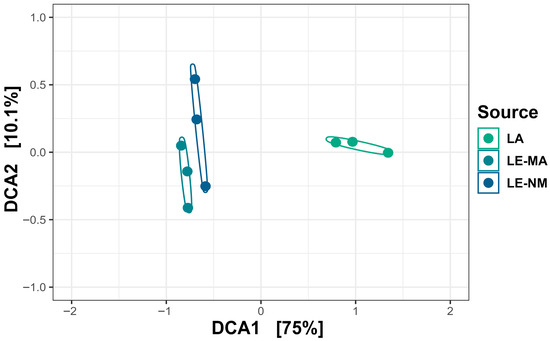 The microbial communities of the soil samples were analyzed by sequencing the 16S rDNA genes to determine the abundances of bacterial genera across different time points. Differences in alpha diversity metrics were observed. On day 0, for both the Shannon diversity index and richness, LE-MA was greater than LA and LE-NM (p < 0.05), while there were no differences between LA and LE-NM (p > 0.05) (Figure 1). A PERMDISP test revealed that microbial variability did not differ significantly by soil source (p = 0.4284). However, PERMANOVA indicated that bacterial structure of the microbiota differed significantly by the source of soil (p = 0.0062; R2 = 0.64367). Detrended correspondence analysis (DCA) plots supported the PERMANOVA results, indicating clustering by soil type, with LE-MA and LE-NM bacteria being more closely related compared to LA microbiota (Figure 2).