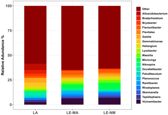While variation existed, on day 0, the most relatively abundant genera were similar for LE-MA and LE-NM (Figure 3). The predominant genera in LE-MA soil were Vicinamibacter (6.20%), Flavisolibacter (4.18%), Microvirga (4.03%), Planococcus (2.52%), Flavitalea (2.15%), Haliangium (2.09%), and Massilia (1.86%), while the most abundant genera in LE-NM soil were Vicinamibacter (6.80%), Microvirga (5.97%), Flavisolibacter (3.27%), Massilia (2.51%), Gaiella (2.16%), and Skermanella (1.81%). In LA soil, the dominant taxa were Alloacidobacterium (6.38%), Gaiella (4.67%), Gemmatimonas (3.80%), Bradyrhizobium (3.71%), Occallatibacter (3.20%), and Bryobacter (2.49%).
