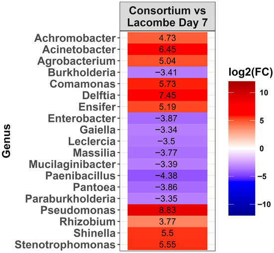 Heat map of the relative abundance of the genera in the Lacombe (LA) consortium that showed a significant change [p < 0.0001] compared to Lacombe day 7 potted soil. The colors displayed represent the average log2(FC) of amplicon sequence variants (ASVs) with a significant change (p < 0.0001) within the respective genera.
