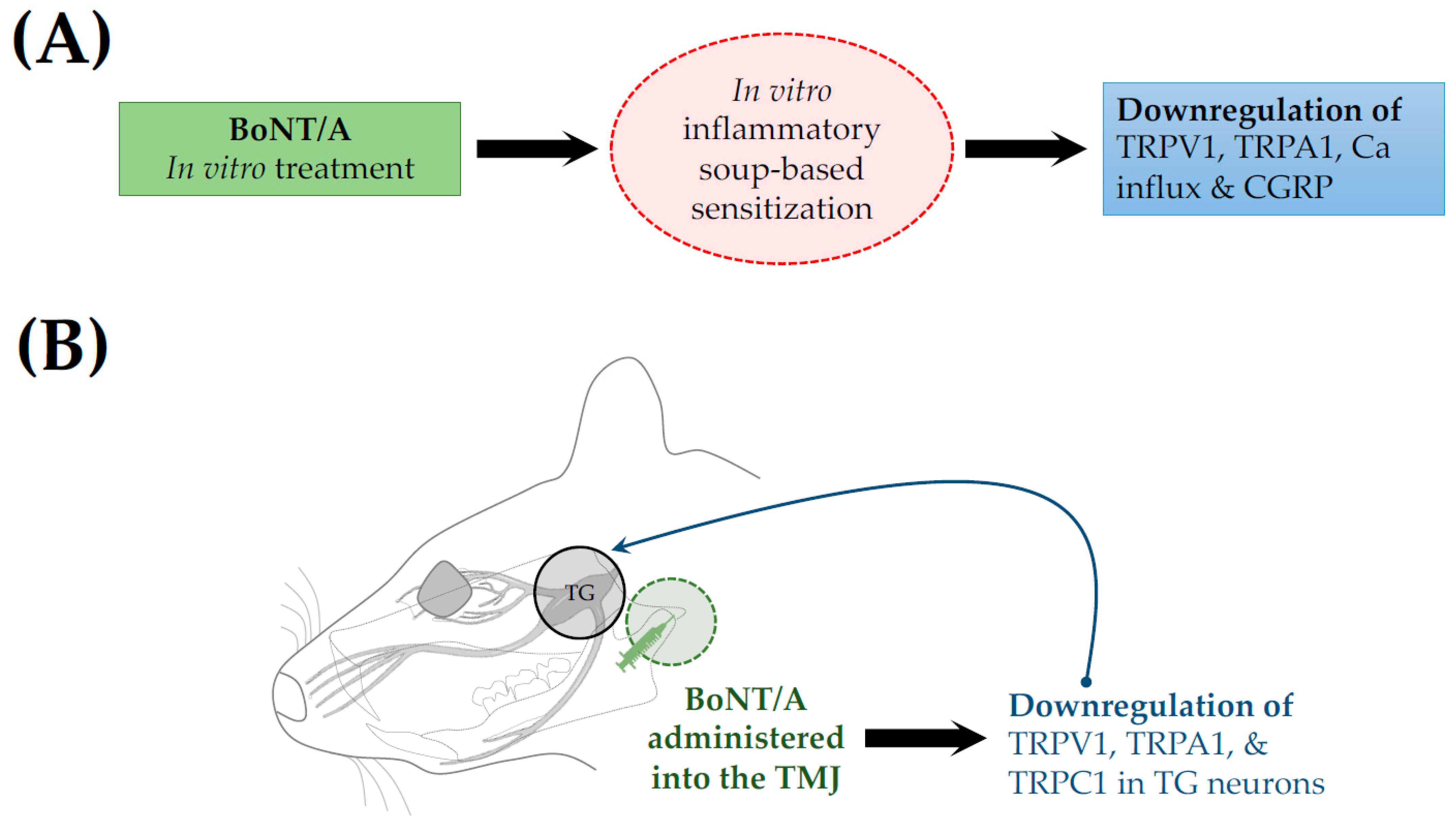 - Cho, J.H.; Son, J.Y.; Ju, J.S.; Kim, Y.M.; Ahn, D.K. Cellular Mechanisms Mediating the Antinociceptive Effect of Botulinum Toxin A in a Rodent Model of Trigeminal Irritation by a Foreign Body. J. Pain 2022, 23, 2070–2079. [Google Scholar] [CrossRef]