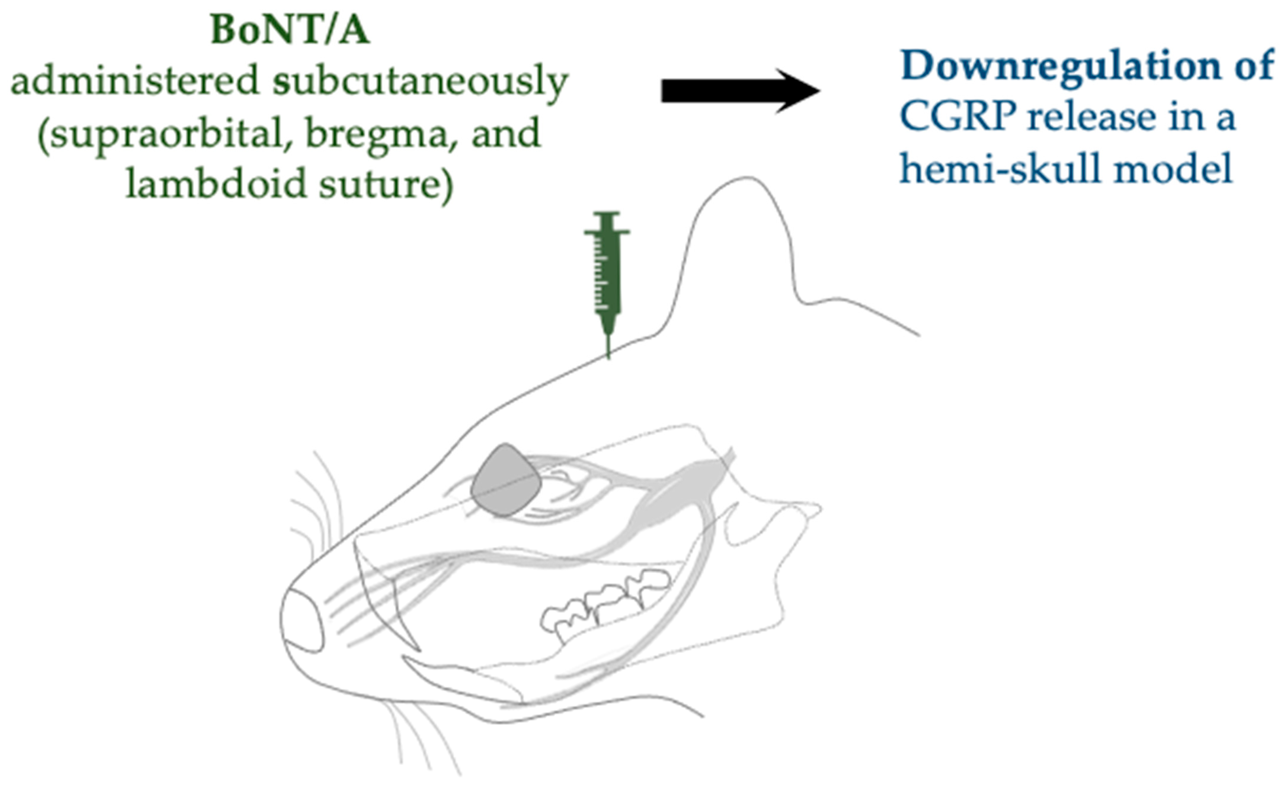 - Reducha, P.V.; Bömers, J.P.; Edvinsson, L.; Haanes, K.A. The Impact of the Migraine Treatment onabotulinumtoxinA on Inflammatory and Pain Responses: Insights from an Animal Model. Headache J. Head Face Pain 2024, 64, 652–662. [Google Scholar] [CrossRef]