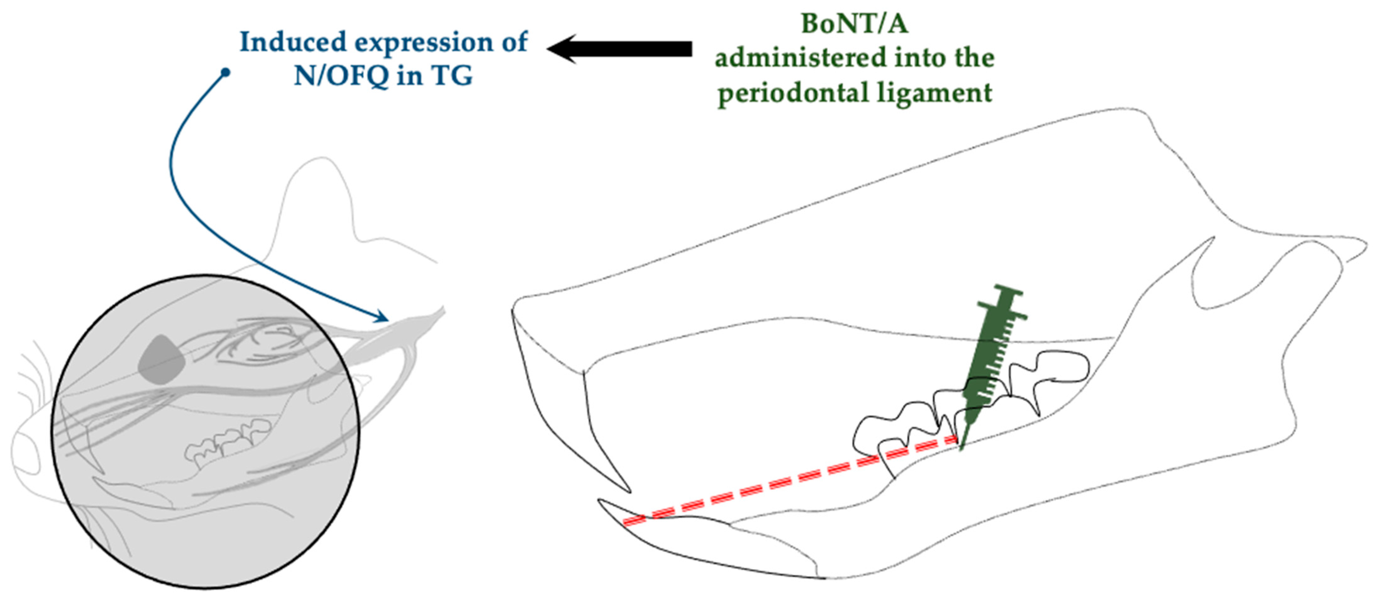 - Lyu, J.; Wen, J.; Guo, R.; Zhu, Y.; Liang, H.; Gao, M.; Wang, H.; Lai, W.; Long, H. Botulinum Toxin A Alleviates Orofacial Nociception Induced by Orthodontic Tooth Movement through Nociceptin/Orphanin-FQ Pathway in Rats. Arch. Oral Biol. 2020, 117, 104817. [Google Scholar] [CrossRef]